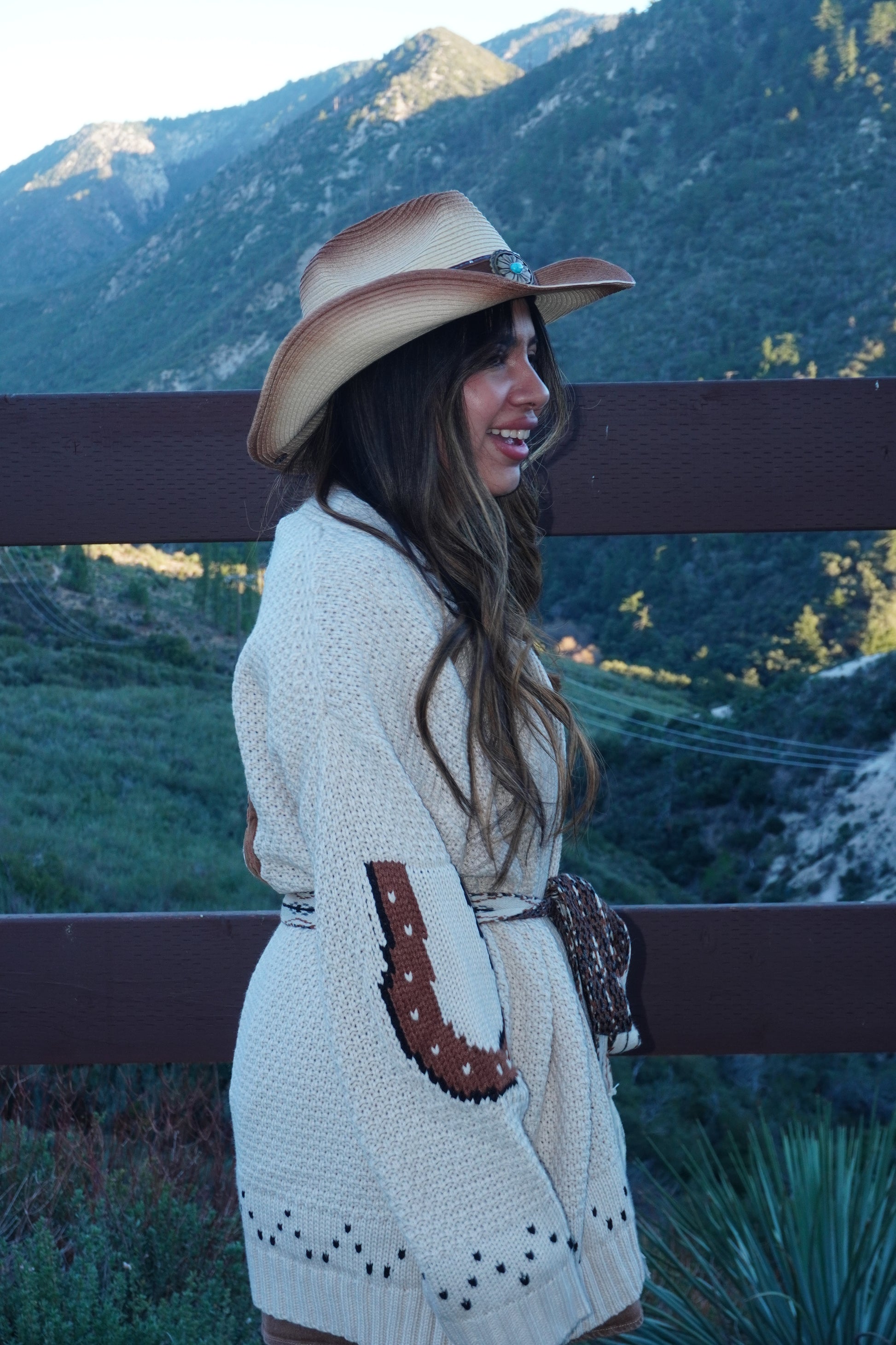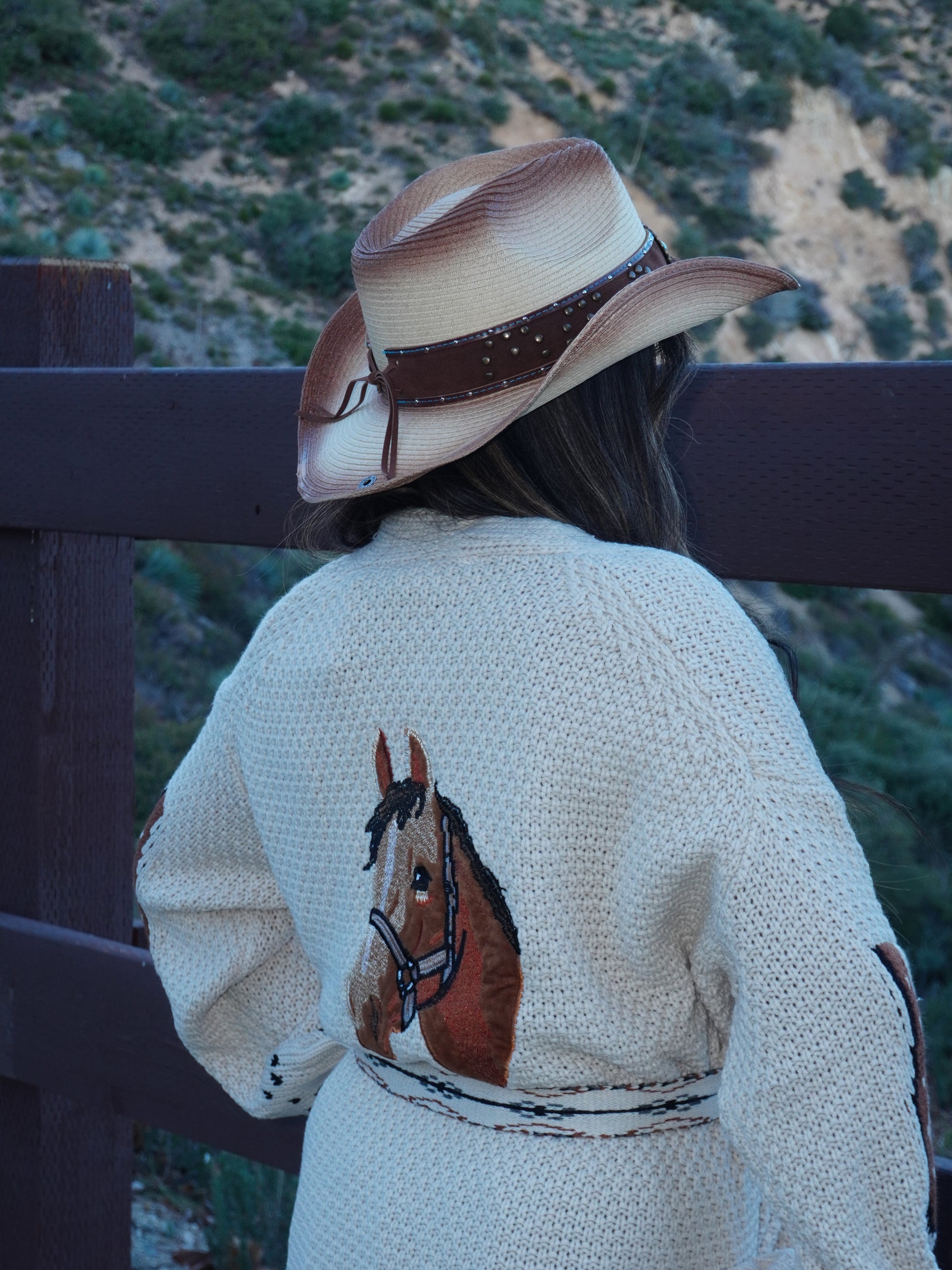 The Pony Dreams Cardigan offers a cozy open front design with wide sleeves, featuring charming horse embroidery and a horseshoe pattern on the sleeves. The detachable braided waist tie adds versatility, making it a stylish addition to any equestrian-inspired wardrobe.